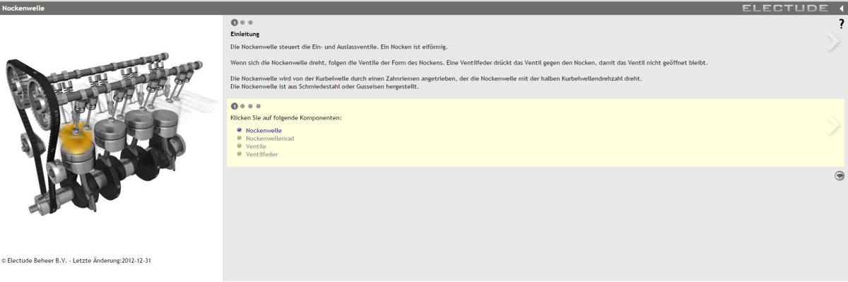 Electude ist die umfassenste und effektivste Kfz-E-Learning-Lösung am Markt. Electude unterstützt Lernende bei allen fahrzeugspezifischen Themen und führt sie mit interaktiven Animationen und Simulationen in Wartung und Instandsetzung von Fahrzeugen ein.Inhalte in Electude werden in Form von Modulen angeboten. Ein Modul kann eine Theoriestunde enthalten, es könnte auch eine pädagogische Computersimulation sein, ein Test, ein interessanter Link oder Ihr eigenes Aufgabenblatt das Sie entwickelt haben. Es gibt auch Module zur eigenständigen Durchführung praktischer Arbeiten an Lehrsystemen oder Fahrzeugen. Kurz gesagt, Module beinhalten alle Elemente die einen großen Teil des Lehrplans ausmachen. Mehrere Module nach Lernzielen gruppiert werden Kurs genannt.