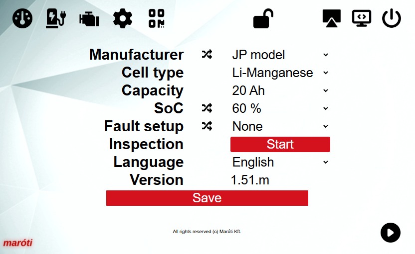 - Einstellbare Parameter: Hersteller, Zelltyp, Ladezustand (SoC) und Kapazität